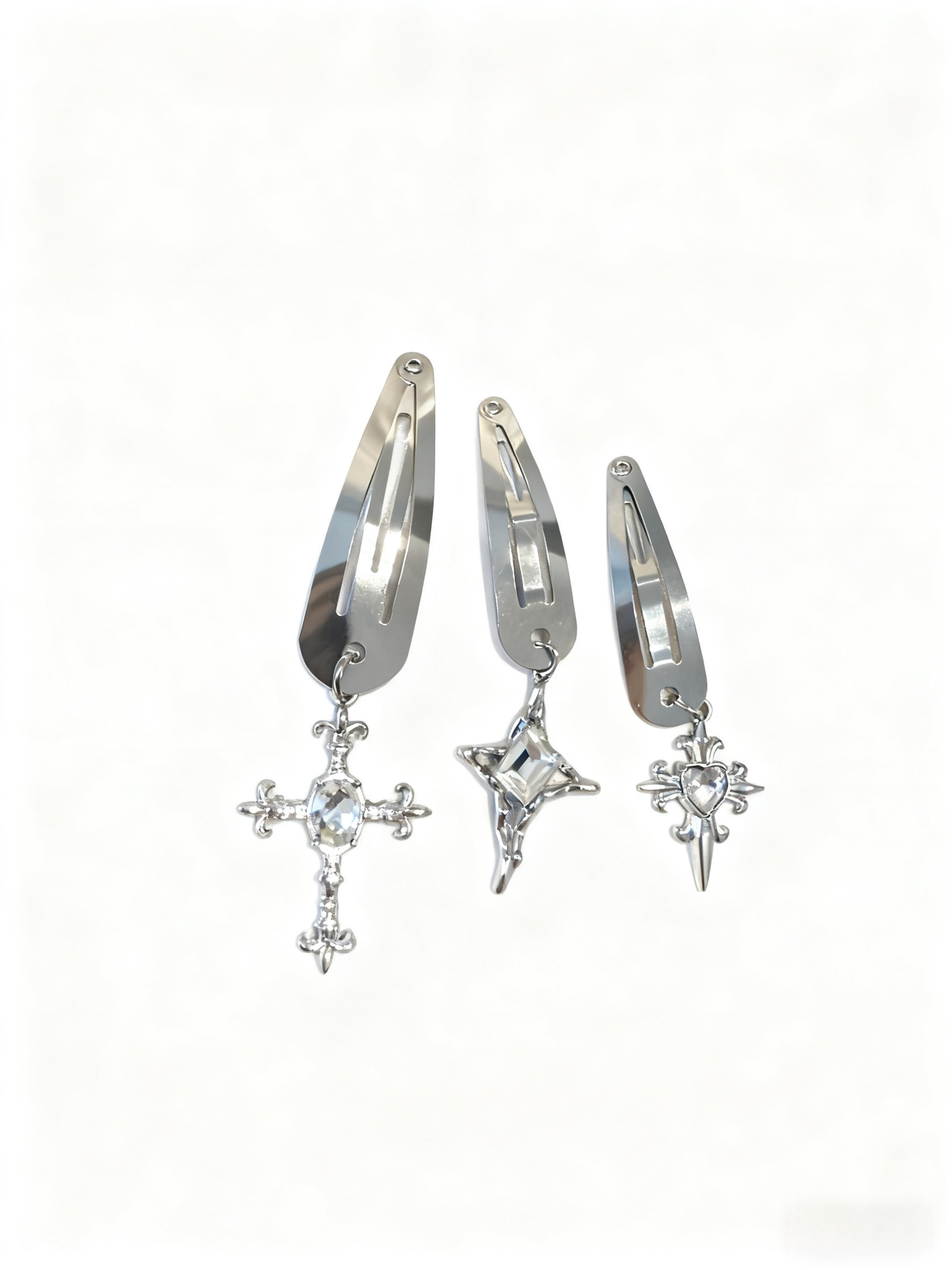 Includes 3 metal hair clips: cross, star, and crystal designs